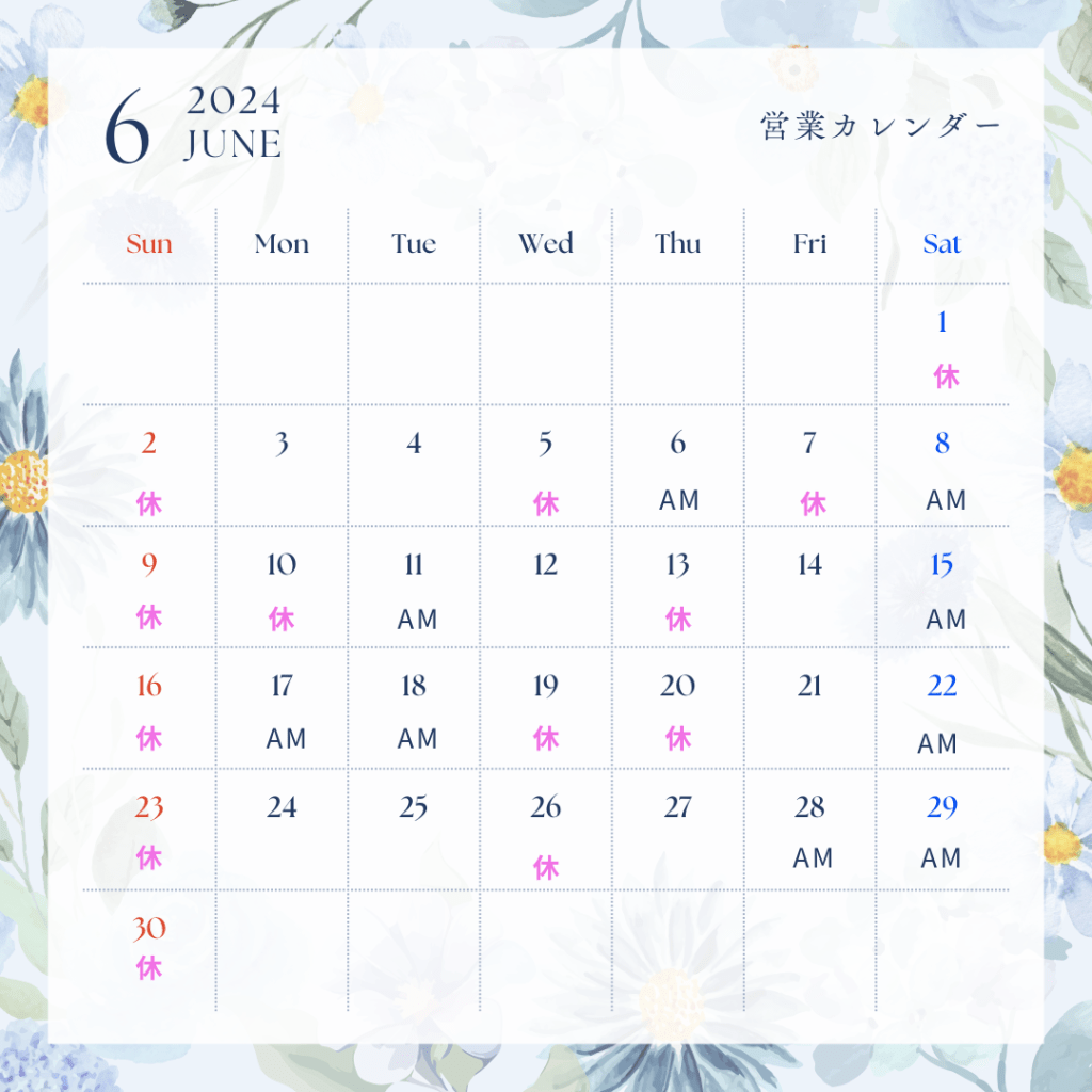 6月の営業日のお知らせです。今月も不定期にお休みをいただいております。
