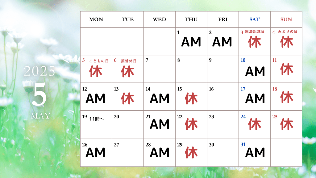 5月は連休がある関係で、休診日が多くなっていますが、皆さまの来院をお待ちしております🕊️